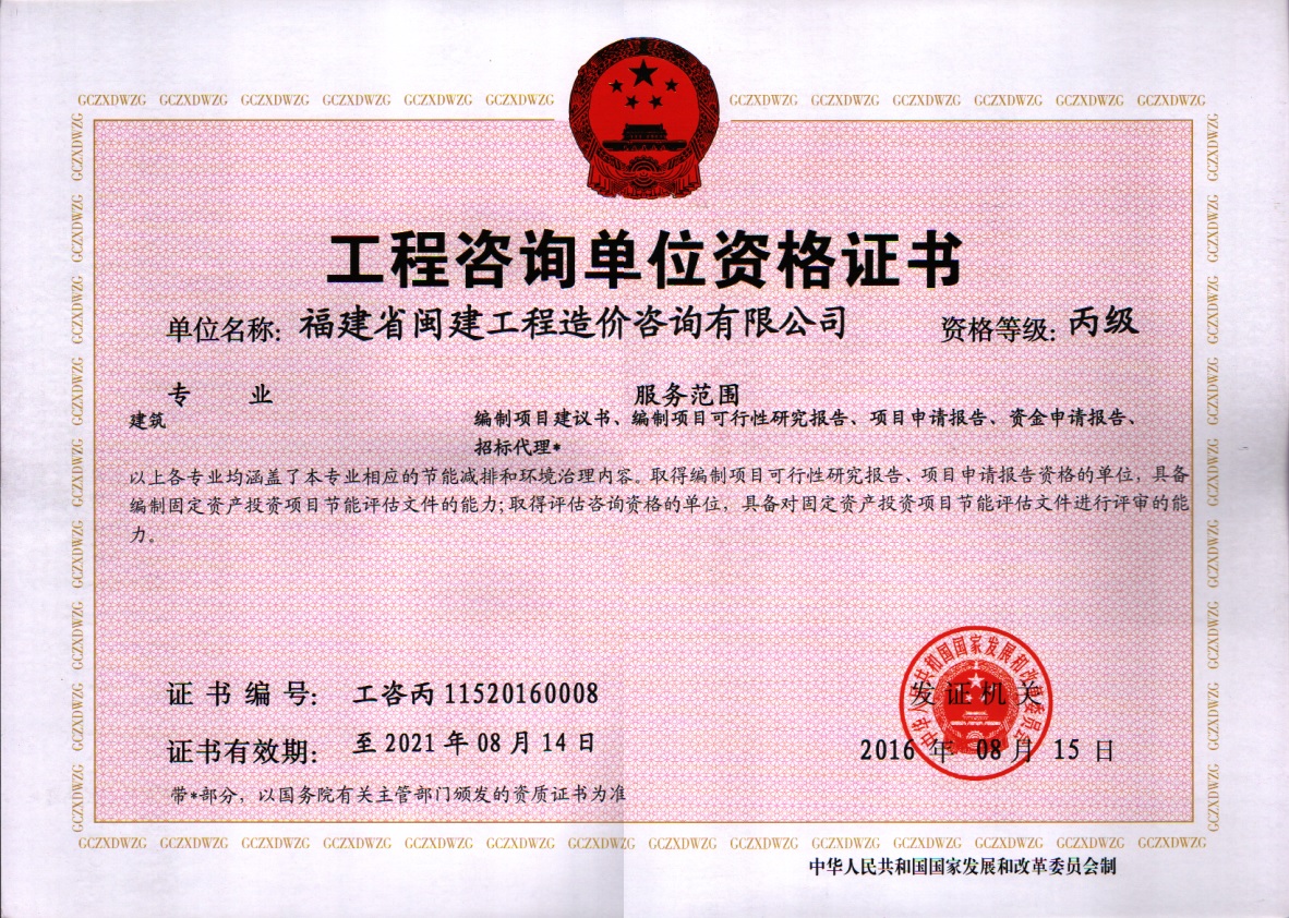 福建省閩建工程造價咨詢有限公司成立于1993年,原隸屬福建省建設委員會,2001年脫鉤改制為有限責任公司,公司注冊資本1200萬元,是一家具有甲級工程招標代理資質(證書編號:F135000429)、甲級工程造價咨詢資質(證書編號:甲150135000084)、政府采購代理資質、預備級中央投資項目招標代理機構資質(證書編號:ZYTZ-C2013239)、丙級工程資質(證書編號:工咨丙11520160008)的綜合性工程咨詢服務單位。能承擔各類建設項目的工程招標代理、工程造價咨詢...